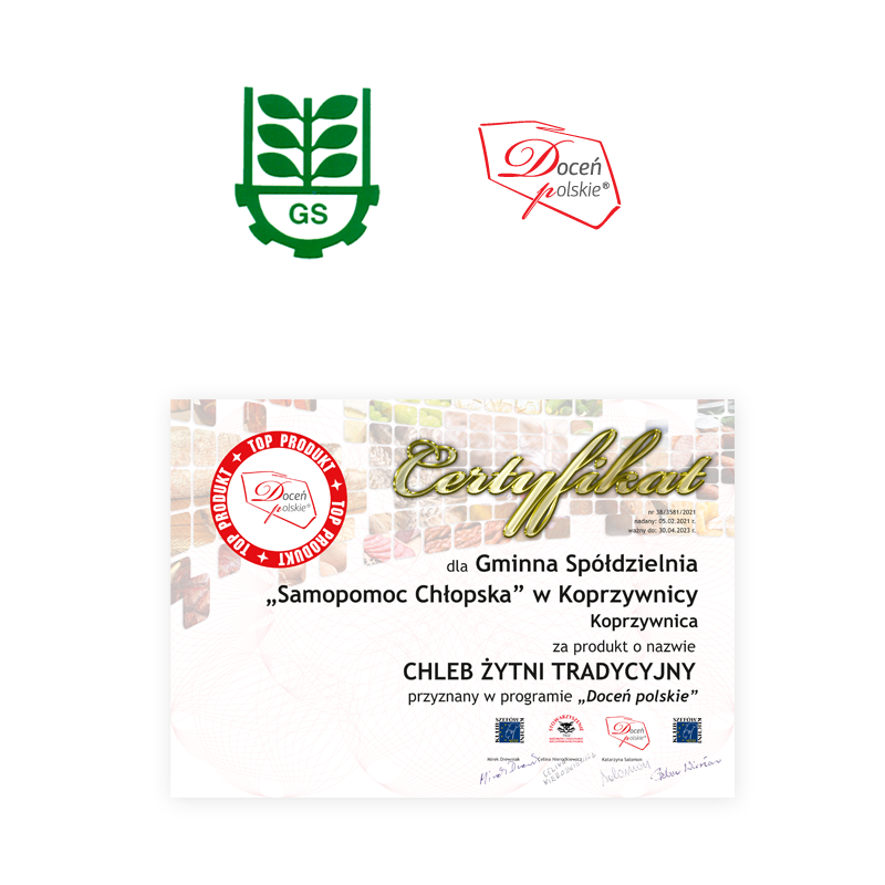 Chleb żytni tradycyjny z oferty Gminnej Spółdzielni „Samopomoc Chłopska” w Koprzywnicy jest laureatem XXXVIII certyfikacji Ogólnopolskiego Programu Promocyjnego „Doceń polskie” . Podczas atestacji, która odbyła się w dniu 3 lutego br. eksperci Programu przyznali mu maksymalne noty za smak, wygląd oraz stosunek ceny do jakości. Chleb żytni tradycyjny z koprzywnickiej spółdzielni sięgnął po godło „Doceń polskie TOP PRODUKT” już po raz czwarty! Chleb żytni tradycyjny jest także posiadaczem Perły 2014 otrzymanej w konkursie Nasze Kulinarne Dziedzictwo – Smaki Regionów na najlepszy polski regionalny produkt żywnościowy 2014 roku.