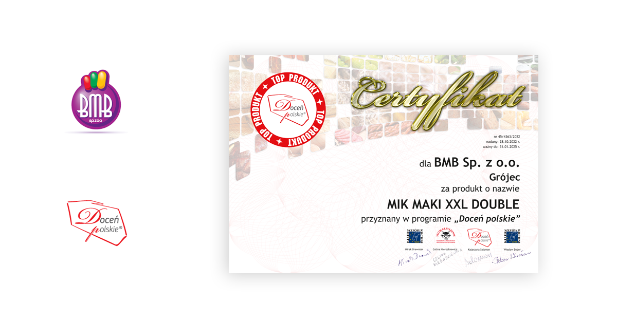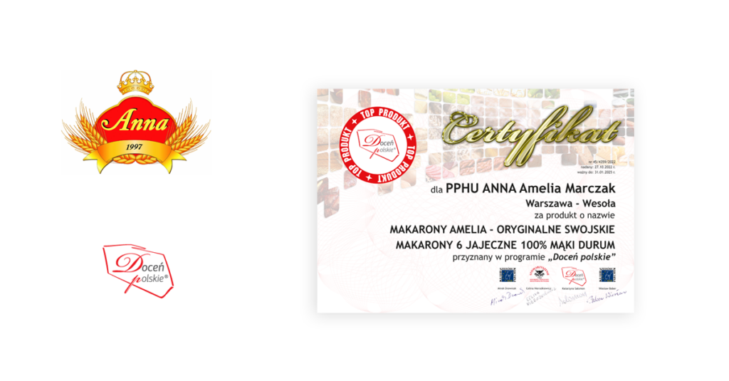 Podczas 45. certyfikacji Ogólnopolskiego Programu Promocyjnego „Doceń polskie” członkowie Loży Ekspertów ocenili jedną z propozycji Makaronów Anna – Makarony Amelia – oryginalne swojskie makarony 6 jajeczne 100% mąki durum. Ten znakomity produkt po raz kolejny znalazł się w gronie laureatów programu i został uhonorowany godłem „Doceń polskie TOP PRODUKT”.