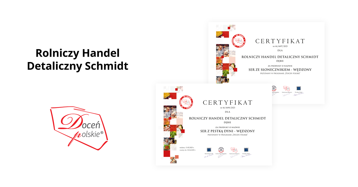 Podczas 46.certyfikacji Ogólnopolskiego Programu Promocyjnego „Doceń polskie” członkowie Loży Ekspertów wyróżnili dwie propozycje firmy Rolniczy Handel Detaliczny Schmidt. Ser ze słonecznikiem – wędzony oraz Ser z pestką dyni – wędzony to dwa wyjątkowe specjały, które sięgnęły po godło „Doceń polskie TOP PRODUKT” przeznaczone dla produktów o wyjątkowych walorach.