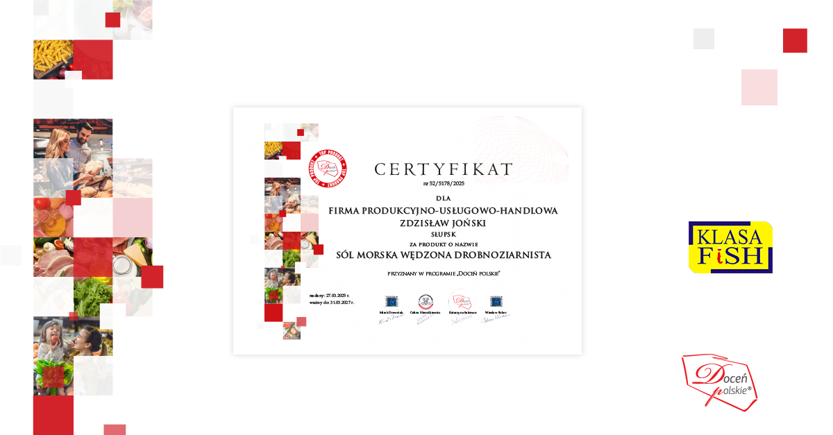 Klasa Fish czerpie inspirację z natury, by dostarczać wyjątkowe produkty. Firma wzięła udział w 52. Certyfikacji Ogólnopolskiego Programu Promocyjnego „Doceń Polskie”, podczas której jej starania zostały docenione przez ekspertów, którzy przyznali jej Wędzonej soli morskiej drobnoziarnistej prestiżowe godło „Doceń Polskie TOP PRODUKT”.