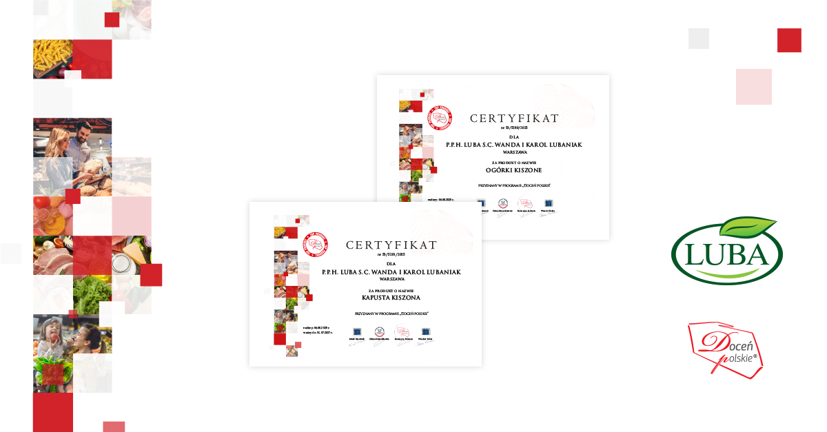 Podczas 53. certyfikacji Ogólnopolskiego Programu Promocyjnego „Doceń polskie”, marka Luba po raz kolejny została wyróżniona za jakość swoich tradycyjnych kiszonek. Kapusta kiszona oraz ogórki kiszone otrzymały godło „Doceń polskie TOP PRODUKT”, potwierdzając, że firma od lat utrzymuje stały, wysoki poziom.