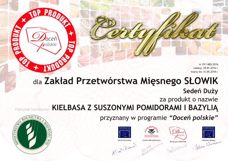 docne_polskie_ZPM-Slowik_kielbasa-z-suszonymi-pomidorami Published 9 lutego 2016 at 750 × 530 in Dwa certyfikaty i tytuł TOP PRODUKT dla mazowieckiej firmy