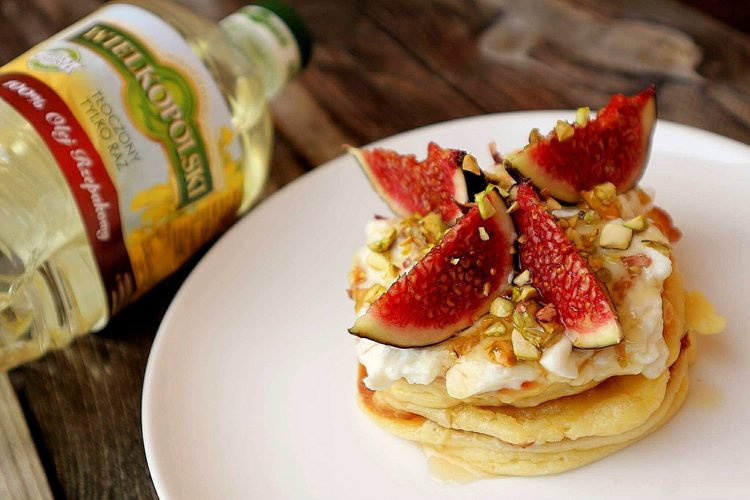 Na dwóch talerzach układamy (jeden na drugim) po 2-3 pancakesy, wierzch smarujemy serkiem, na nim układamy pokrojone figi, całość oblewamy miodem i posypujemy pistacjami.