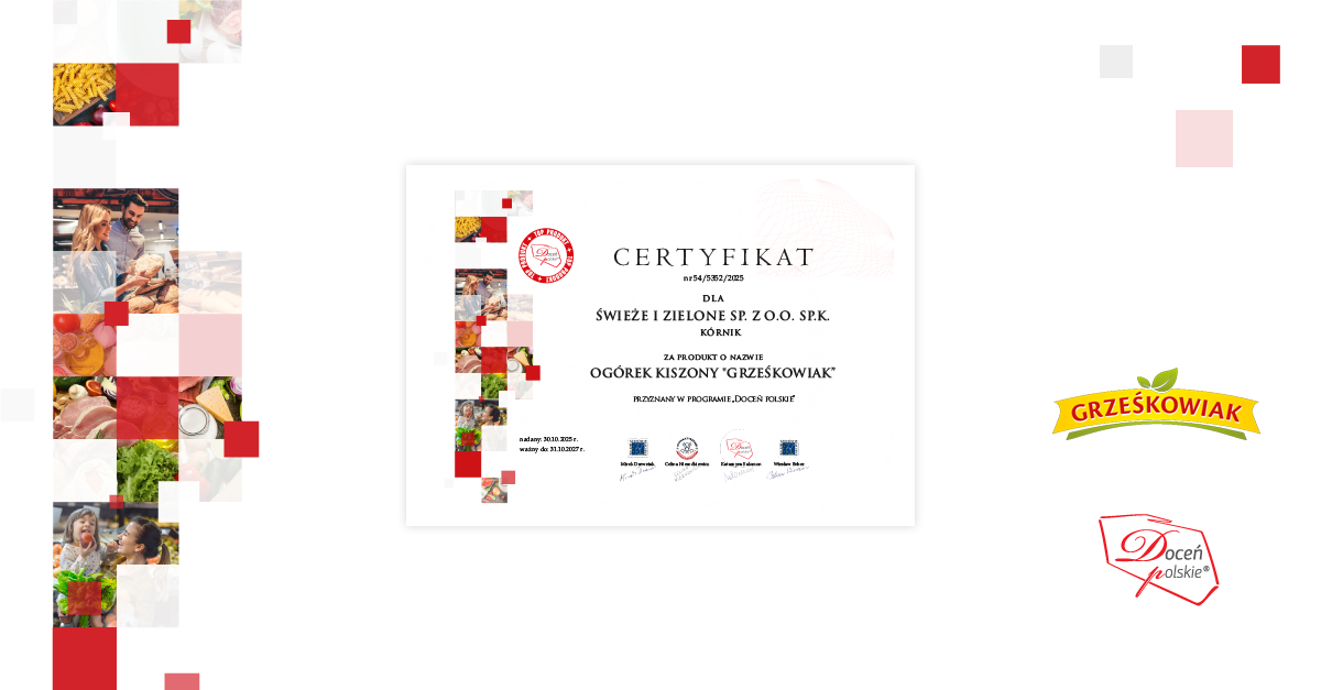 Potwierdzeniem jakości i zaufania do marki jest kolejne zdobycie godła „Doceń polskie TOP PRODUKT” przez Ogórek kiszony Grześkowiak. Wyróżnienie przyznane w ramach Ogólnopolskiego Programu Promocyjnego „Doceń polskie” potwierdza, że flagowy produkt marki niezmiennie spełnia wysokie wymagania ekspertów i konsumentów.