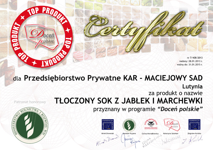 docen_polskie_KAR_tloczony-sok-z-jablek-i-marchewki Published 30 stycznia 2013 at 700 × 495 in Soki z Maciejowego Sadu – strzał w dziesiątkę!