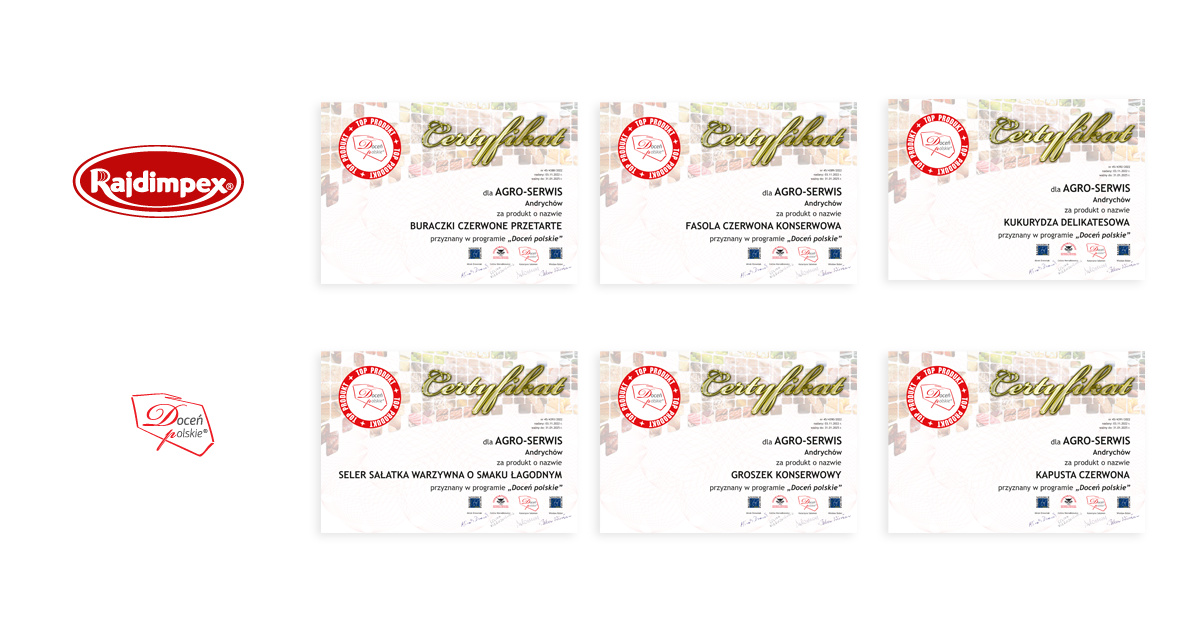Kukurydza delikatesowa, Kapusta czerwona, Buraczki czerwone przetarte, Groszek konserwowy, Fasola czerwona konserwowa i Seler sałatka warzywna o smaku łagodnym wzięły udział w 45. certyfikacji Ogólnopolskiego Programu Promocyjnego „Doceń polskie” i po raz kolejny sięgnęły po godło „Doceń polskie TOP PRODUKT”.