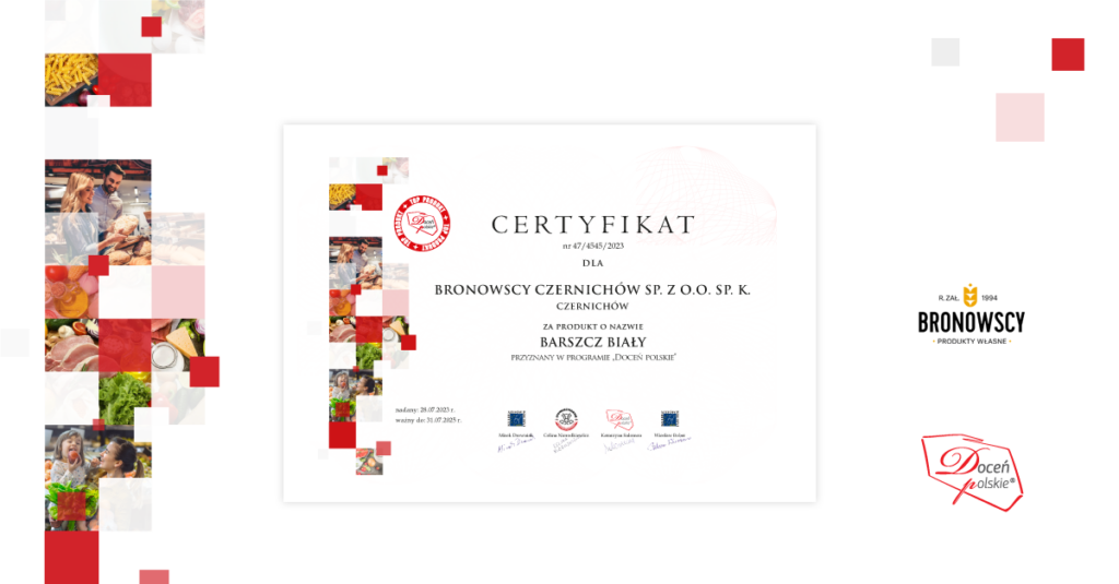 Barszcz biały – tradycyjne danie kuchni polskiej – z oferty firmy Bronowscy Czernichów został po raz kolejny uhonorowany prestiżowym certyfikatem Ogólnopolskiego Programu Promocyjnego „Doceń polskie”. Co warto wiedzieć o tym wyjątkowym produkcie? Barszcz biały wyróżnia się charakterystyczną białą barwą oraz wyrazistym, kwaśnym smakiem, osiągniętym dzięki jednemu z użytych składników – zakwasowi produkowanemu z fermentowanej przez kilka dni mieszanki wody i mąki pszennej. Jego smak doskonale komponuje się z białą kiełbasą, boczkiem lub ugotowanym mięsem wieprzowym oraz jajkami na twardo.