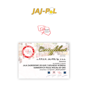 Podczas XXXIX certyfikacji Ogólnopolskiego Programu Promocyjnego „Doceń polskie” wyjątkowe walory Jaj zagrodowych od kur z wolnego wybiegu karmionych paszą wolną od GMO docenili członkowie Loży Ekspertów Programu. Znalazły się one w gronie laureatów programu „Doceń polskie” i zostały uhonorowane godłem „Doceń polskie TOP PRODUKT”.