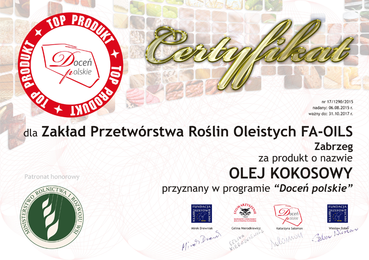 docen_polskie_FA-Oils_olej-kokosowy Published 15 sierpnia 2015 at 750 × 530 in Trzy oleje FA-OILS z certyfikatami „Doceń polskie”