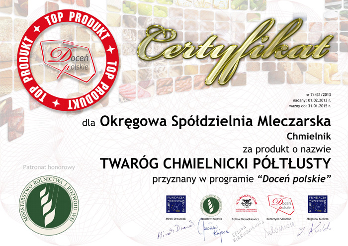 docen_polskie_OSM-Chmielnik_twarog-chmielnicki Published 4 lutego 2013 at 700 × 495 in Twaróg OSM w Chmielniku zdobywcą certyfikatu „Doceń polskie” i miana TOP PRODUKT