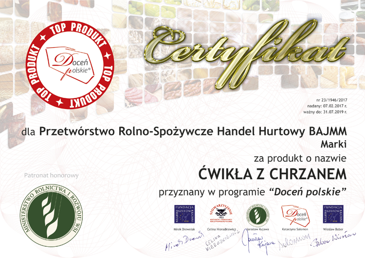 docen_polskie_Bajmm_cwikla-z-chrzanem Published 11 lutego 2017 at 750 × 530 in Wyroby BAJMM docenione w trakcie XXIII audytu żywności